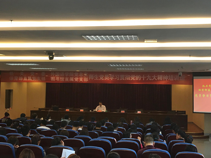 机关党委、外语学院党总支、williamhill英国直属党支部和图书馆直属党支部联合举办学习贯彻党的十九大精神培训班,200多名师生党员参加了学习,校党委常委、组织部长、机关党委书记陆振生主持了培训会。williamhill英国直属党支部全体党员共17人参加了培训班。