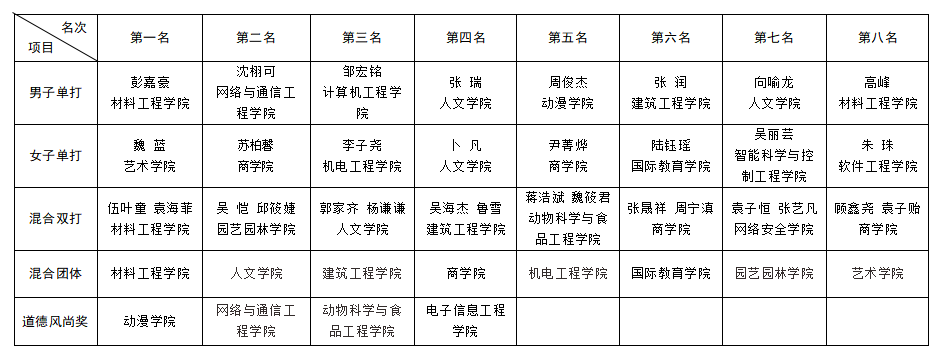 经过单项赛和团体赛激烈角逐,最终成绩如下: