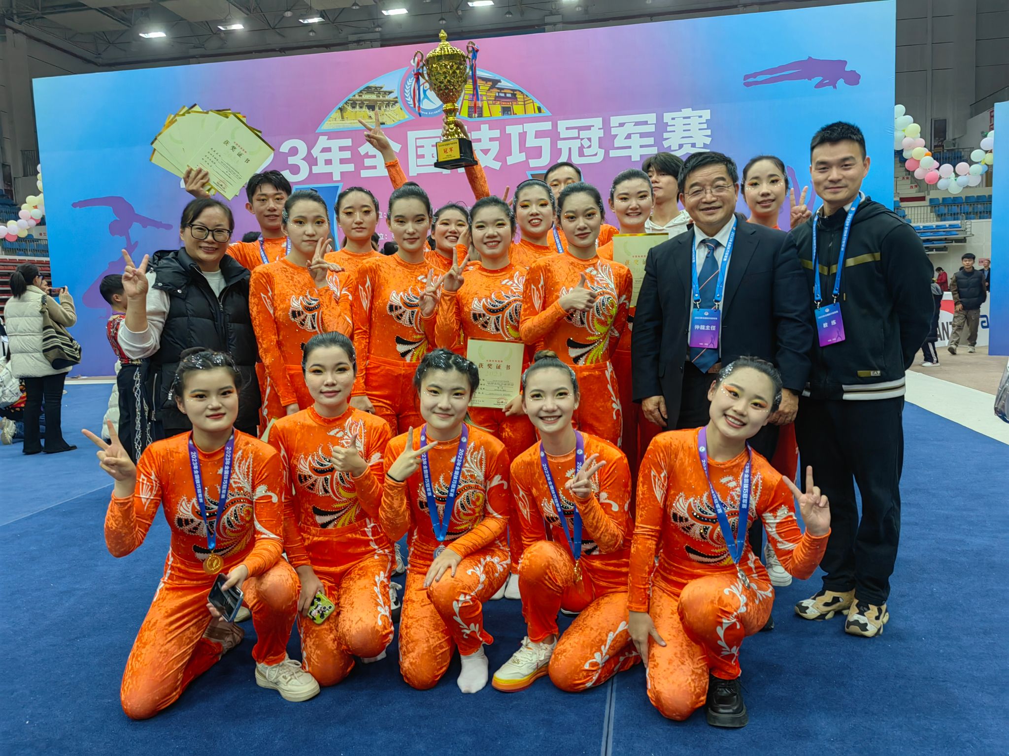 我校蓝屿啦啦操队,首次参加全国技巧冠军赛并崭露头角,荣获佳绩。在青年组大集体三级项目中,同学们压轴出场、顶住压力凭借出色发挥得到了场上裁判的一致肯定并荣获冠军。在青年组三级混合三人项目中,三位同学在决赛中稳定发挥逆转获得冠军;三位同学获得亚军。两位同学获得体育道德风尚奖。