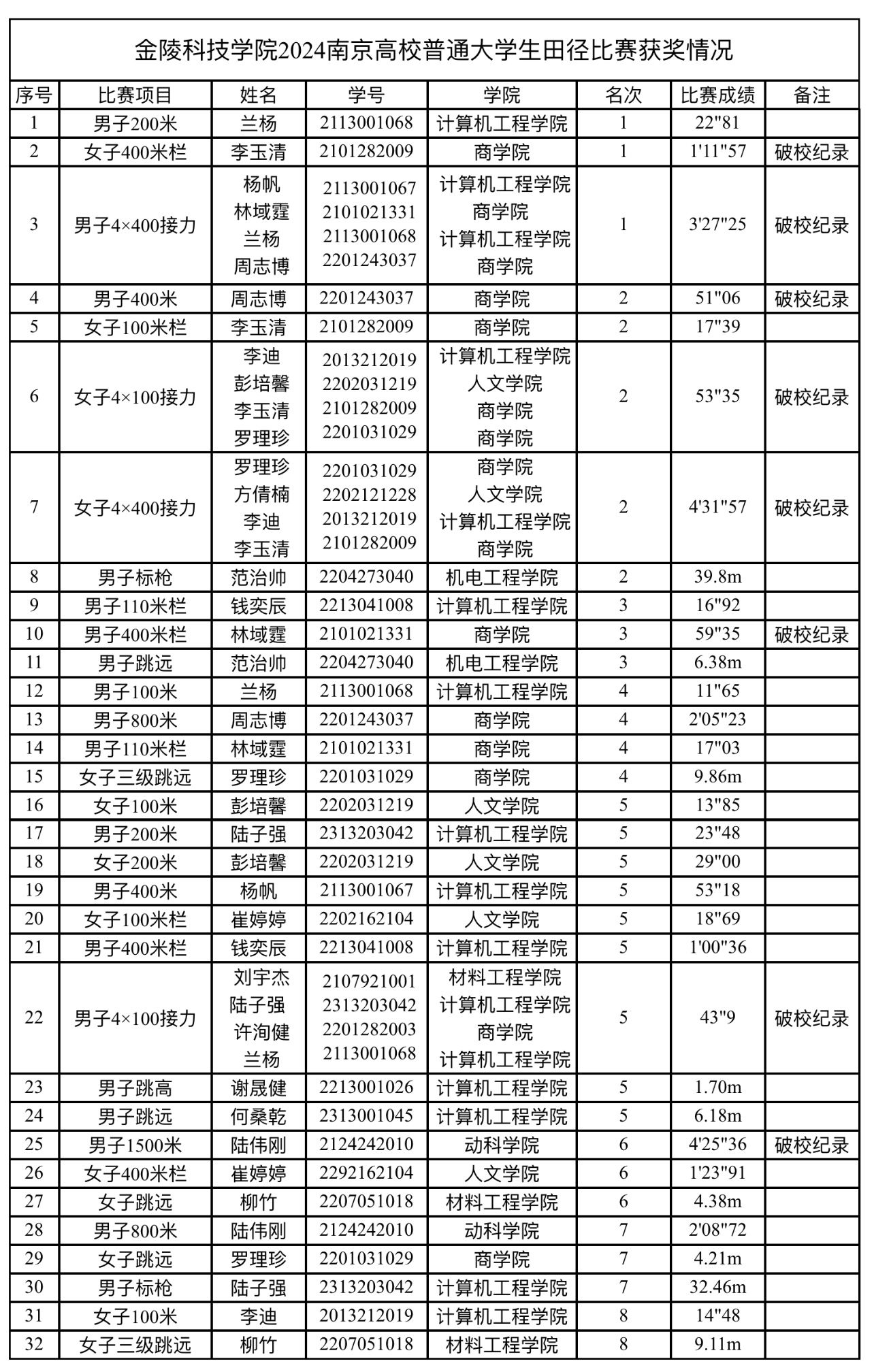 经过激烈角逐,田径队在比赛中共破8项校记录,摘得11枚奖牌,其中金牌3枚,银牌5枚,铜牌3枚。取得了男子团体第二,女子团体第四,男女团体第二的历史最好成绩。