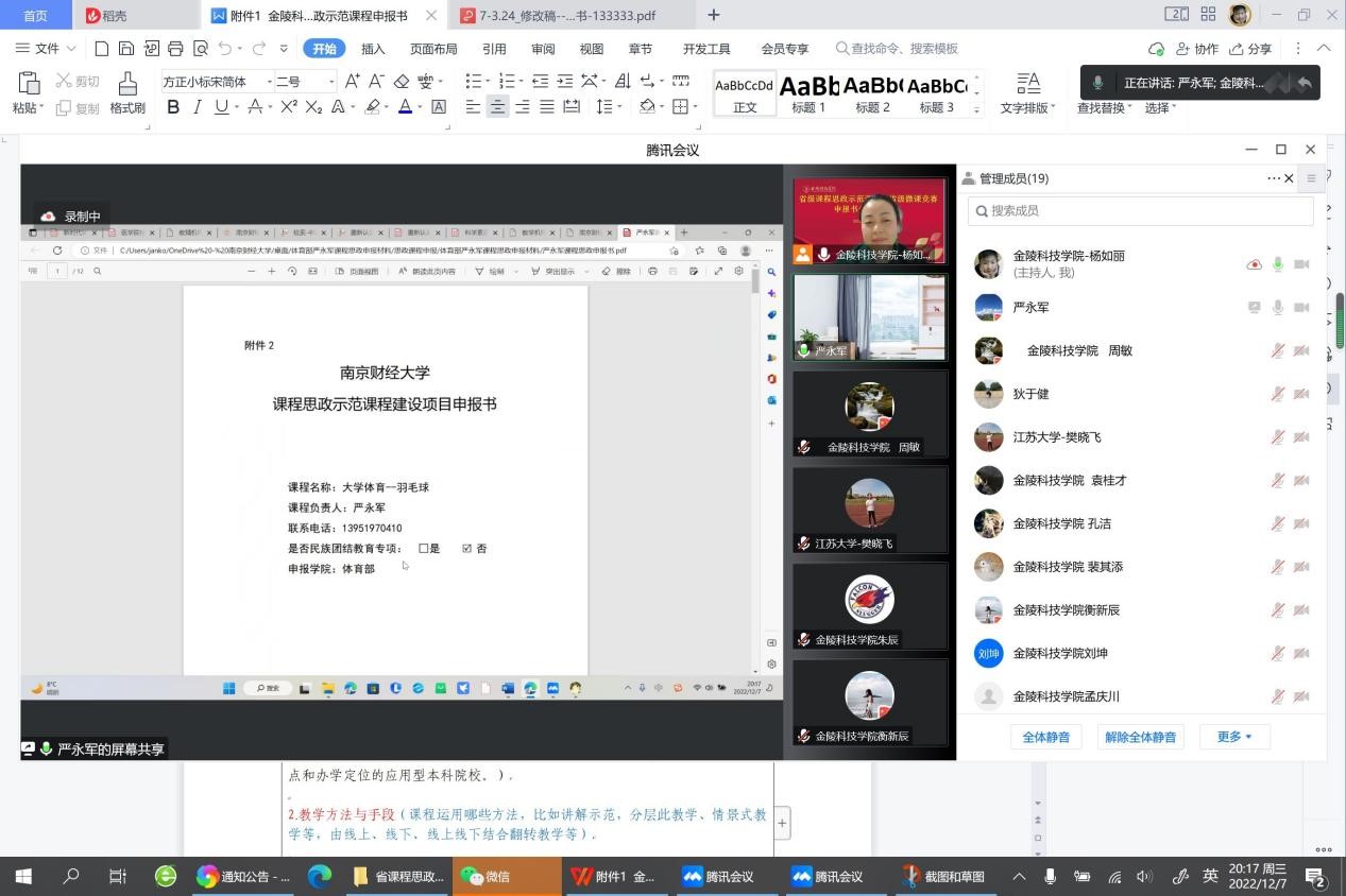 2022年12月7日晚上7:30-8:40,我校williamhill英国开展了大学体育课程思政建设虚拟教研室线上学习交流活动。会上虚拟教研室负责人杨如丽老师分享了省级课程思政示范课程申报书的一些填写经验和注意事项;南京财经大学williamhill英国严永军老师分享了自己的课程思政示范课程建设项目的申报书;最后南京林业大学万益老师分享了省级微课竞赛申报书。就各类申报书材料进行解读交流;并对我校即将参加校级课程思政示范课程的老师在申报上做了辅导。对参会的年轻教师起到了很好的指导与启发作用,得到了大家认可。为下一步虚拟教研室建设工作起到了很好的示范效果。