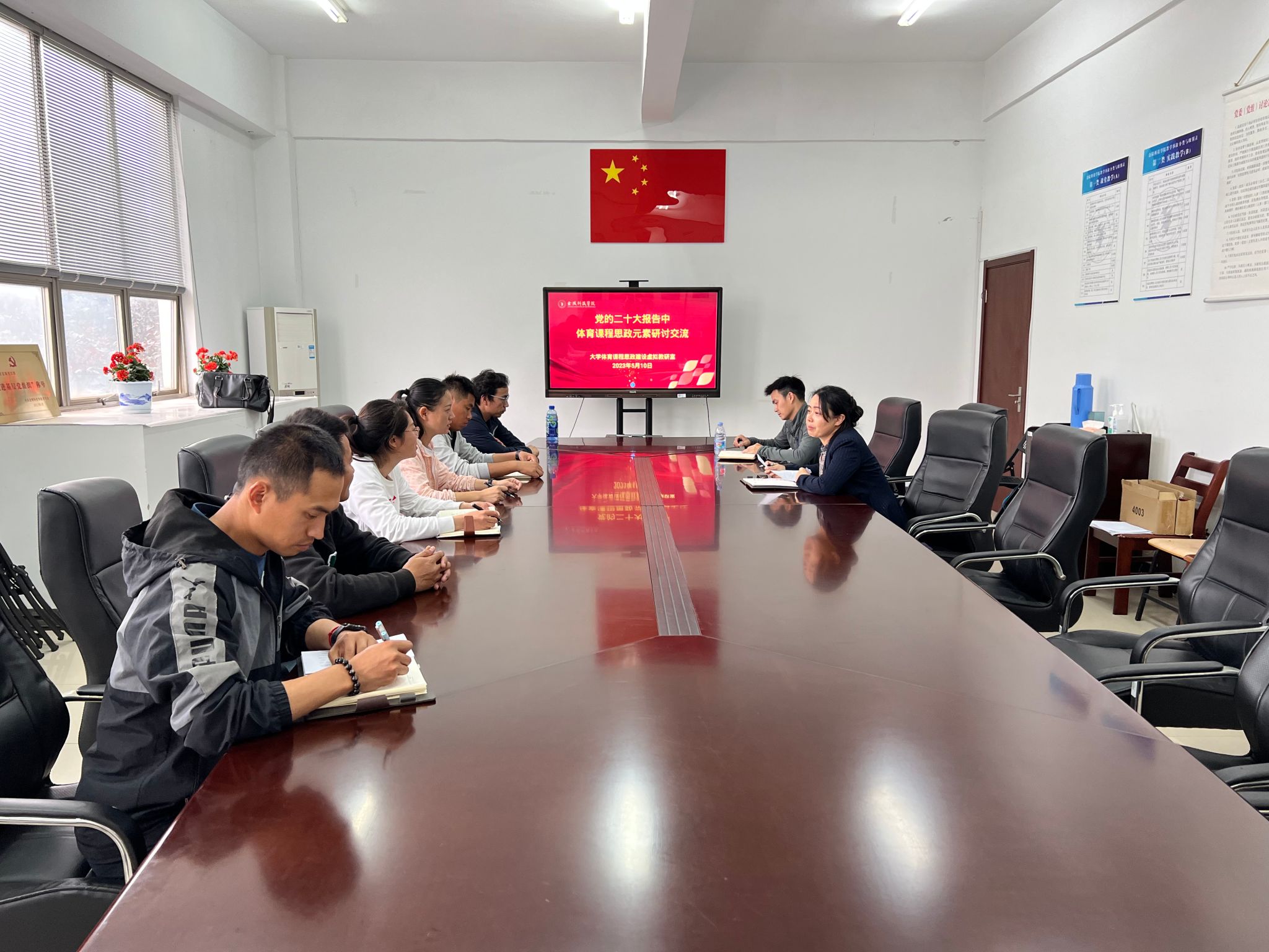 2023年5月10日中午13:00,我校williamhill英国开展了大学体育课程思政建设虚拟教研室第六次研讨交流活动,本次活动交流主题是“党的二十大报告中体育课程思政元素”。首先,虚拟教研室负责人杨如丽老师带领与会老师一起学习并解读党的二十大报告中有关文化、体育、科技、健康等章节内容。接着杨如丽老师重点强调williamhill英国在弘扬中国传统文化方面已做的事情和下一步的设想,在党建创新活动中学习太极拳、石锁、健身龙等传统项目,将中国式现代化、民族优秀传统文化等元素融入体育课教学。最后,杨如丽老师就williamhill英国将在一年级课程加入太极拳、健身龙课程改革提出建议和要求,与会老师就体育课程如何融入传统文化思政元素展开讨论。