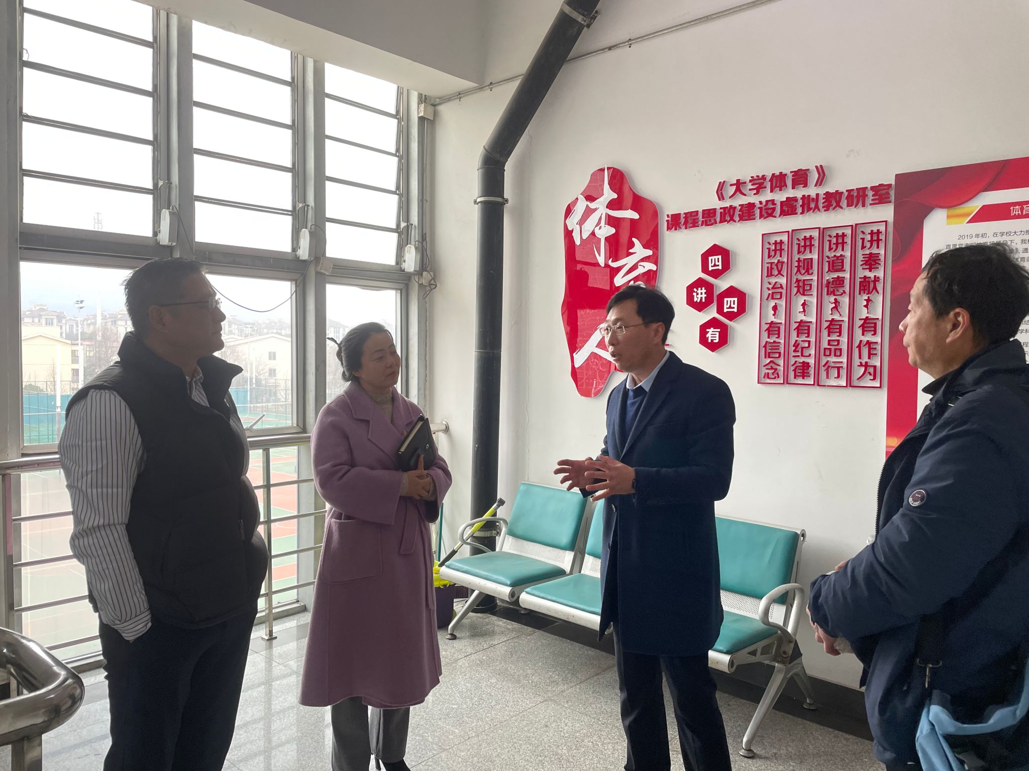 沈辉和杨如丽对南京晓庄学院体育学院张伟院长一行的到来表示热烈欢迎,并介绍了williamhill英国的基本概况、教学环境、教学特色、师资队伍建设等情况,着重介绍了williamhill英国课程思政教学特色、部门党建发展文化墙、工会职工小家、体测房、室内外教学场地等多方面的情况。