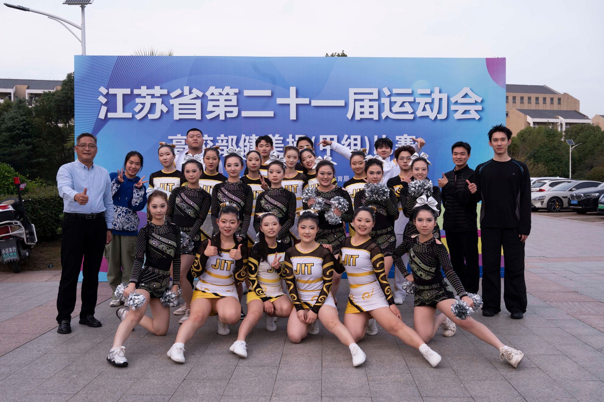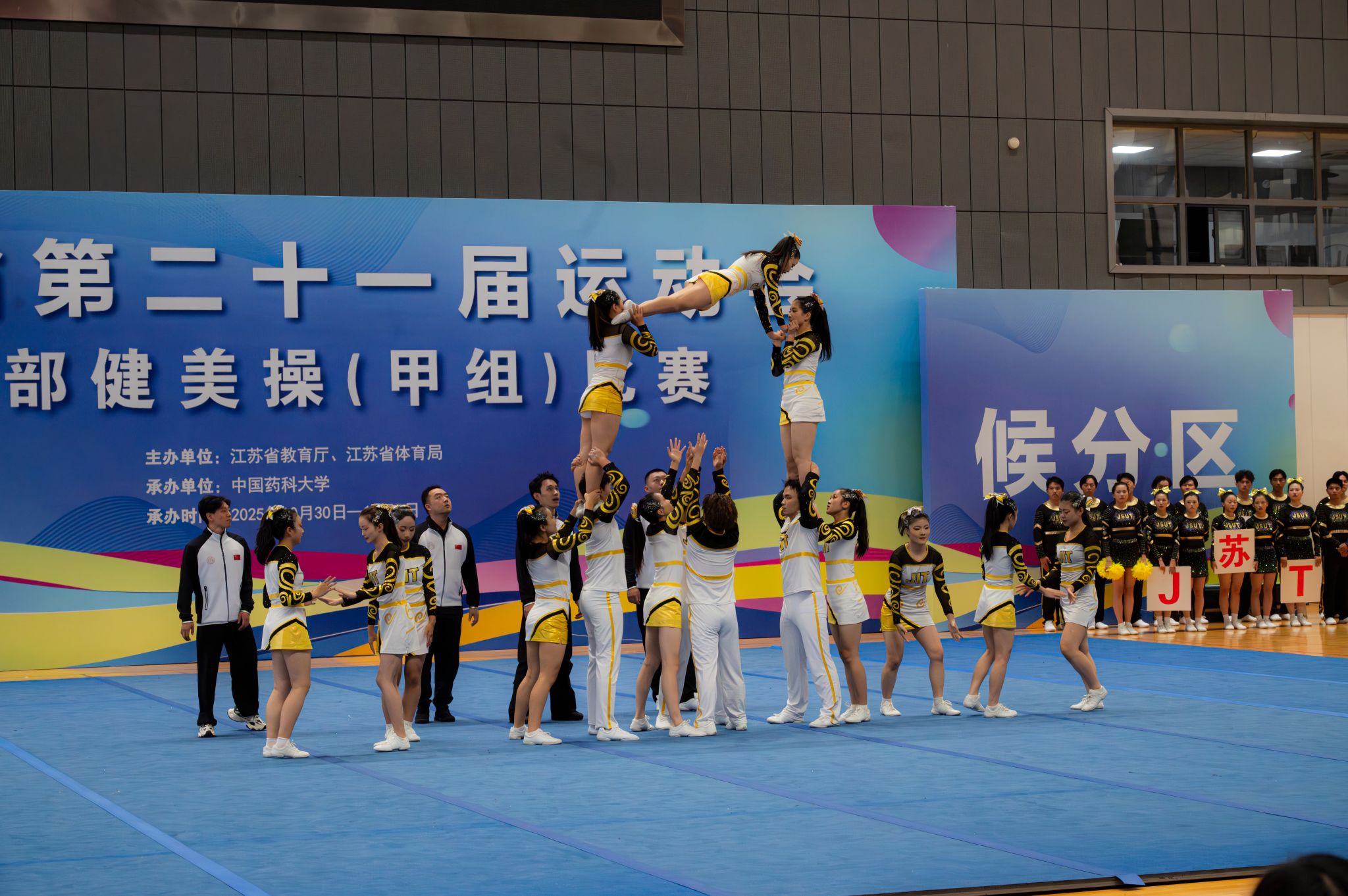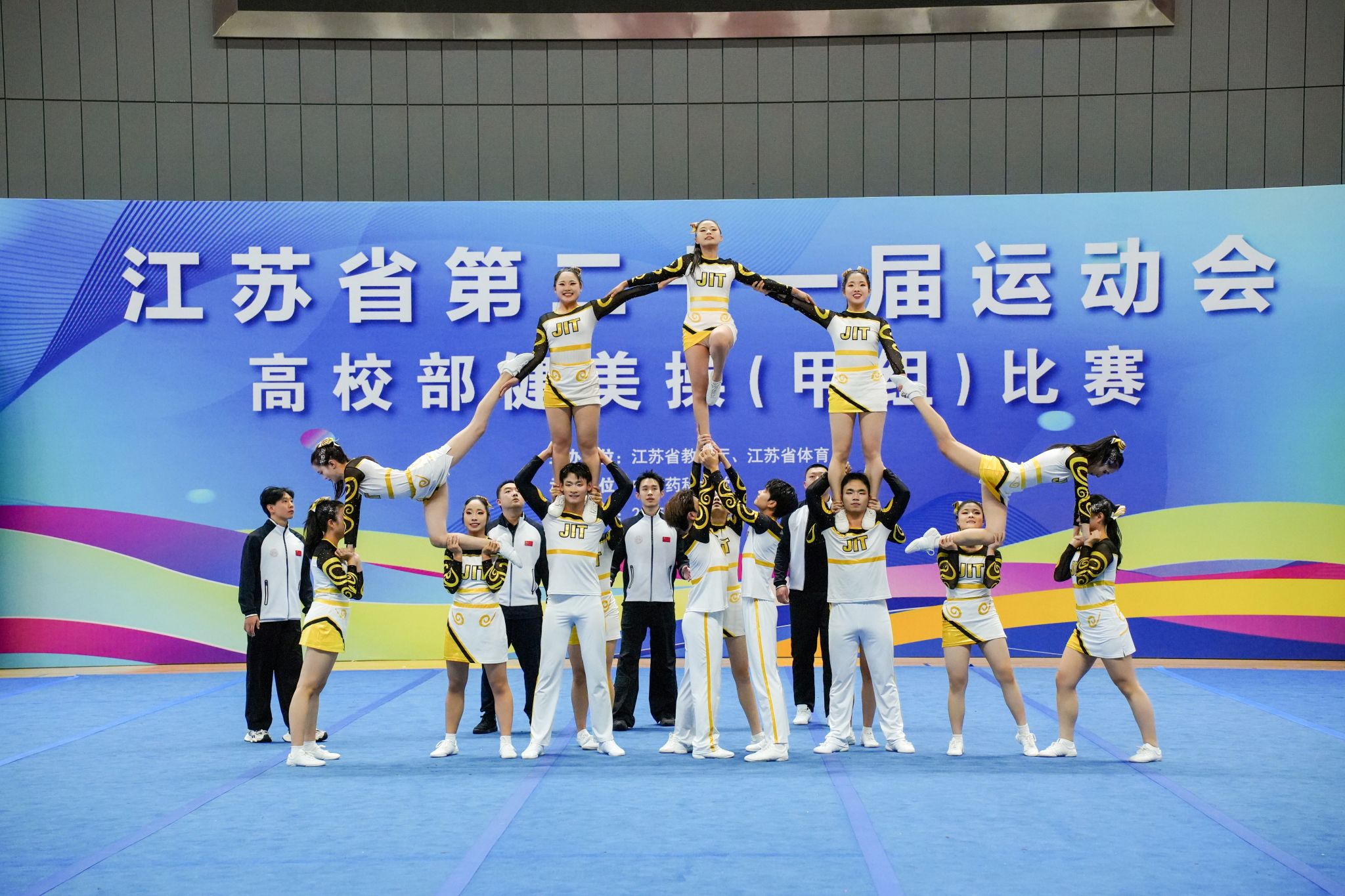 2025年10月30日-11月2日,江苏省第二十一届运动会高校部健美操(甲组)比赛在南京市中国药科大学隆重举行。我校啦啦操队派出了由商学院、人文学院、网通学院、外国语学院院、艺术学院、材料工程学院、国教院、软件学院、智控学院等10个学院共26学生参加了此次比赛,在动感十足的音乐中,以力与美的完美融合,展开一场青春与激情的巅峰对决。最终我校获得了甲B组花球啦啦操第十二名和技巧啦啦操第三名的好成绩,这也是我校首次在省运会该项赛事中站上领奖台。
