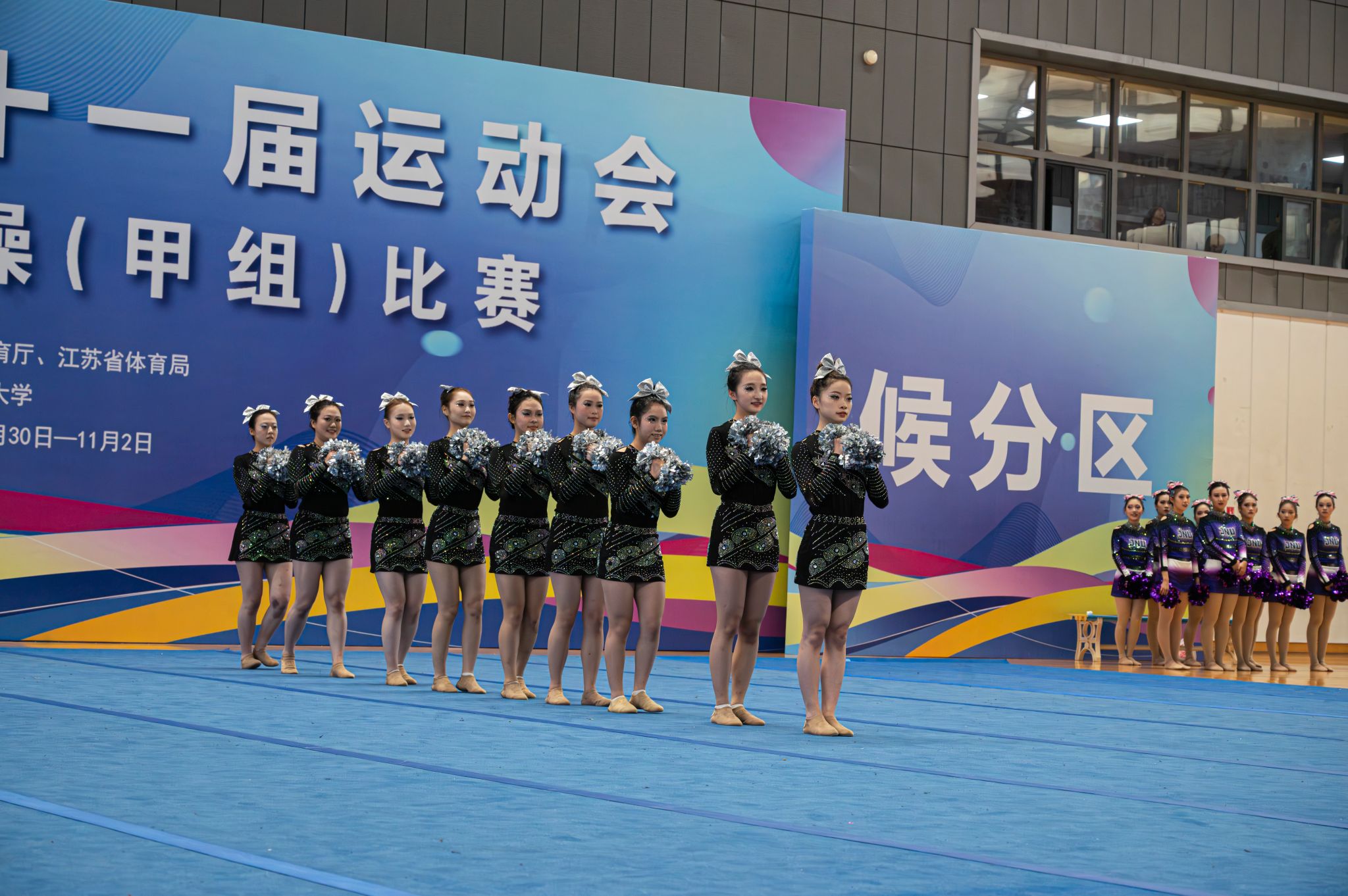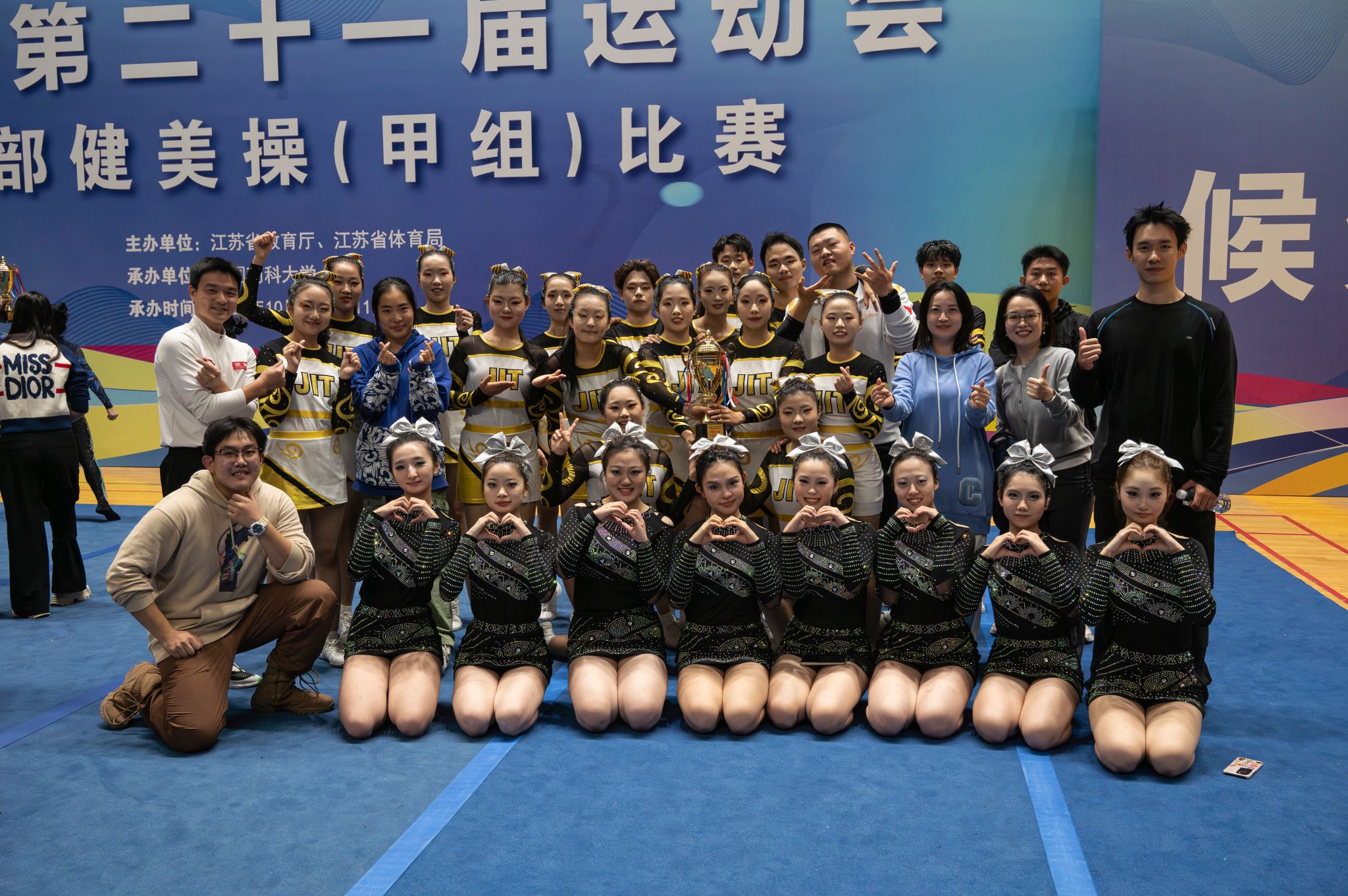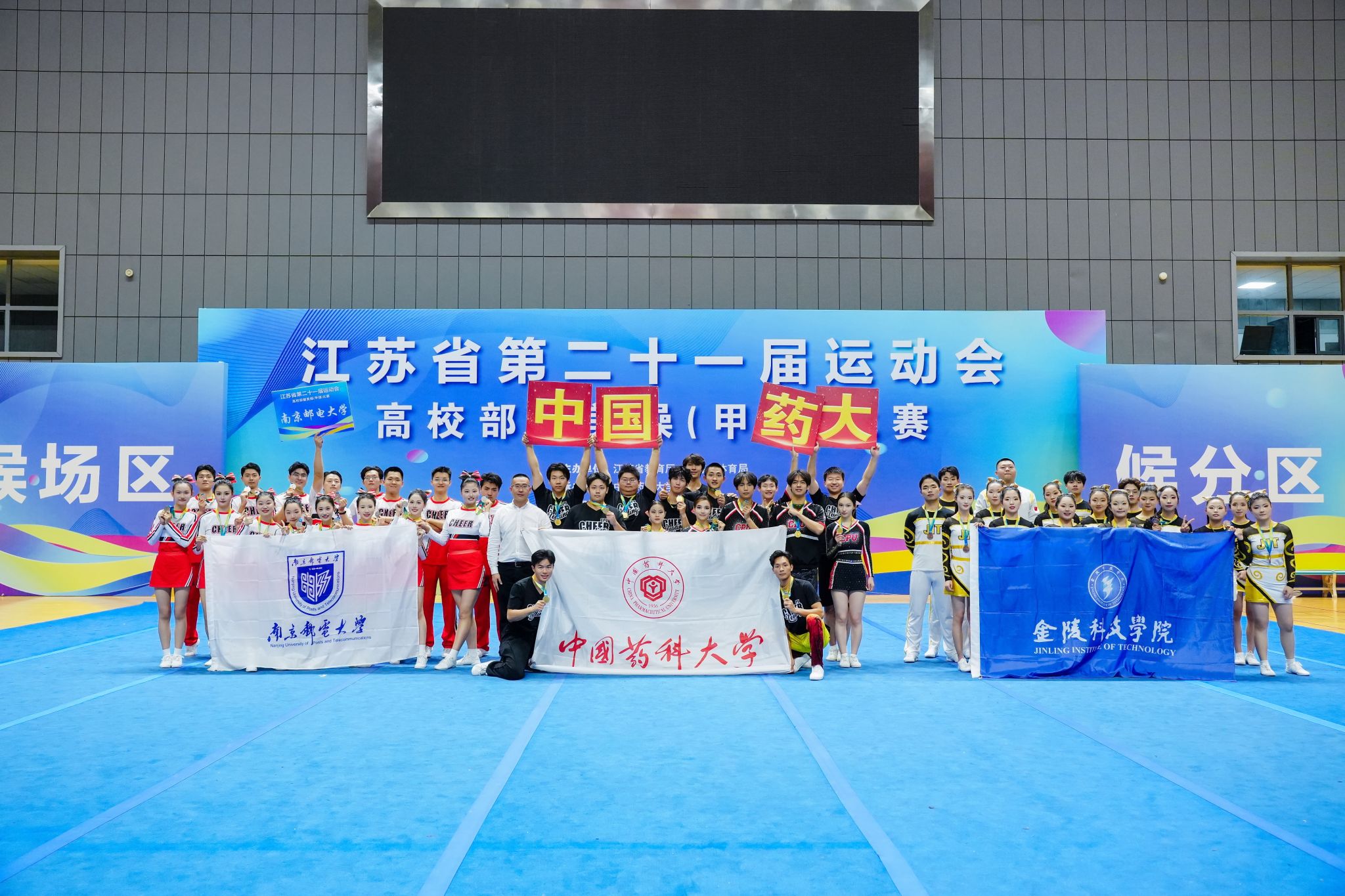 2025年10月30日-11月2日,江苏省第二十一届运动会高校部健美操(甲组)比赛在南京市中国药科大学隆重举行。我校啦啦操队派出了由商学院、人文学院、网通学院、外国语学院院、艺术学院、材料工程学院、国教院、软件学院、智控学院等10个学院共26学生参加了此次比赛,在动感十足的音乐中,以力与美的完美融合,展开一场青春与激情的巅峰对决。最终我校获得了甲B组花球啦啦操第十二名和技巧啦啦操第三名的好成绩,这也是我校首次在省运会该项赛事中站上领奖台。